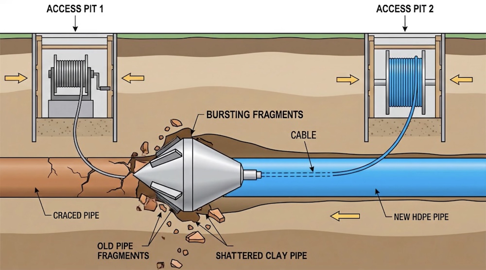 For severely damaged pipes, we can pull a new pipe through the old one, bursting the old pipe while simultaneously laying the new one.